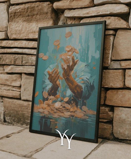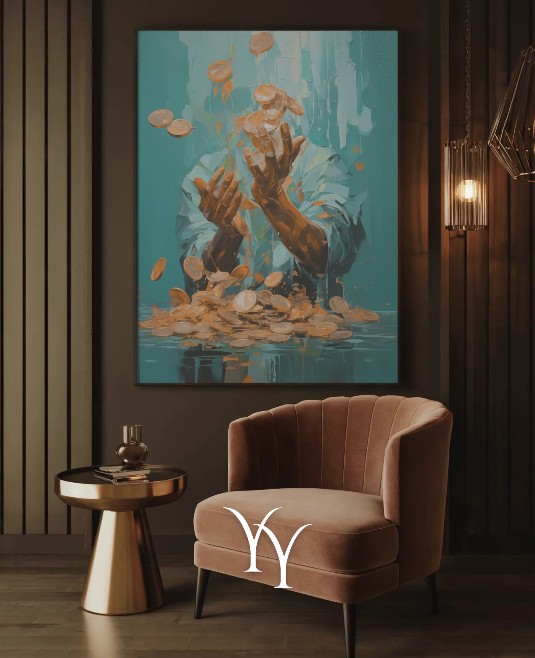 Un portrait abstrait d’un homme enveloppé d’éléments liés à l’argent et à la réussite. Ce tableau mêle art moderne et symboles de richesse, créant une œuvre puissante et inspirante. Parfait pour un bureau, un studio créatif ou un espace dédié à la motivation et à l’ambition.